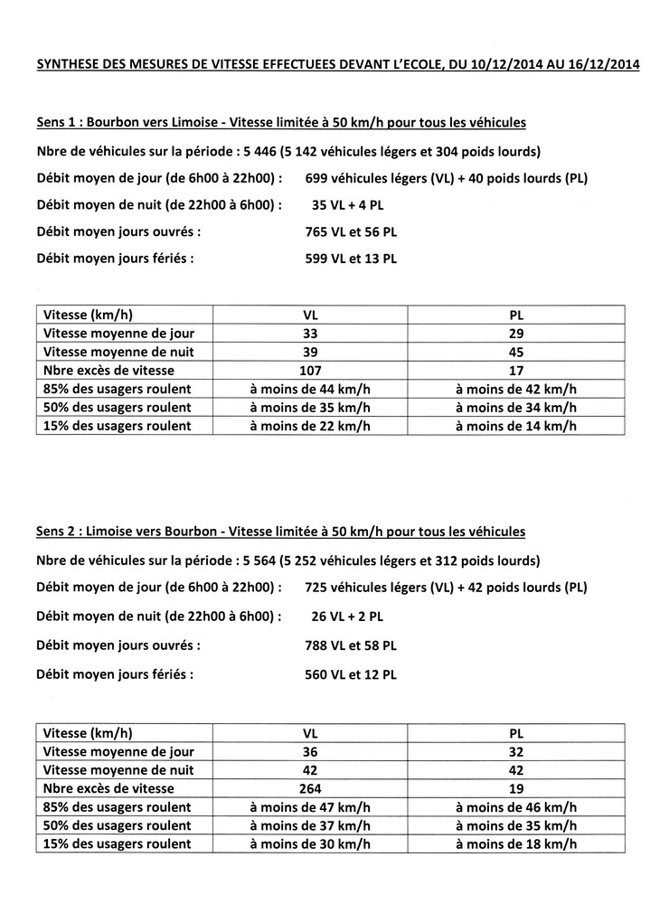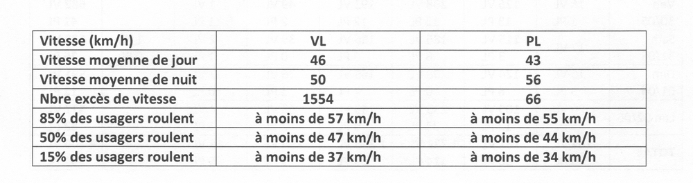 En résumé, dans le sens Bourbon - Limoise, 2,08 % des VL et 5,59 % des PL sont en excès de vitesse. Dans le sens Limoise-Bourbon, 5,03 % des VL et 6,09 % des PL sont en excès de vitesse. Ces documents sont téléchargeables en bas de page